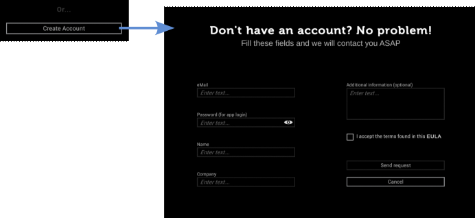 Para poder acceder a la aplicación es necesario usar una cuenta (exceptuando el acceso directo a proyecto). Estas cuentas deben ser solicitadas a través del formulario incluido en la aplicación, accesible desde el botón inferior de la pantalla de login.